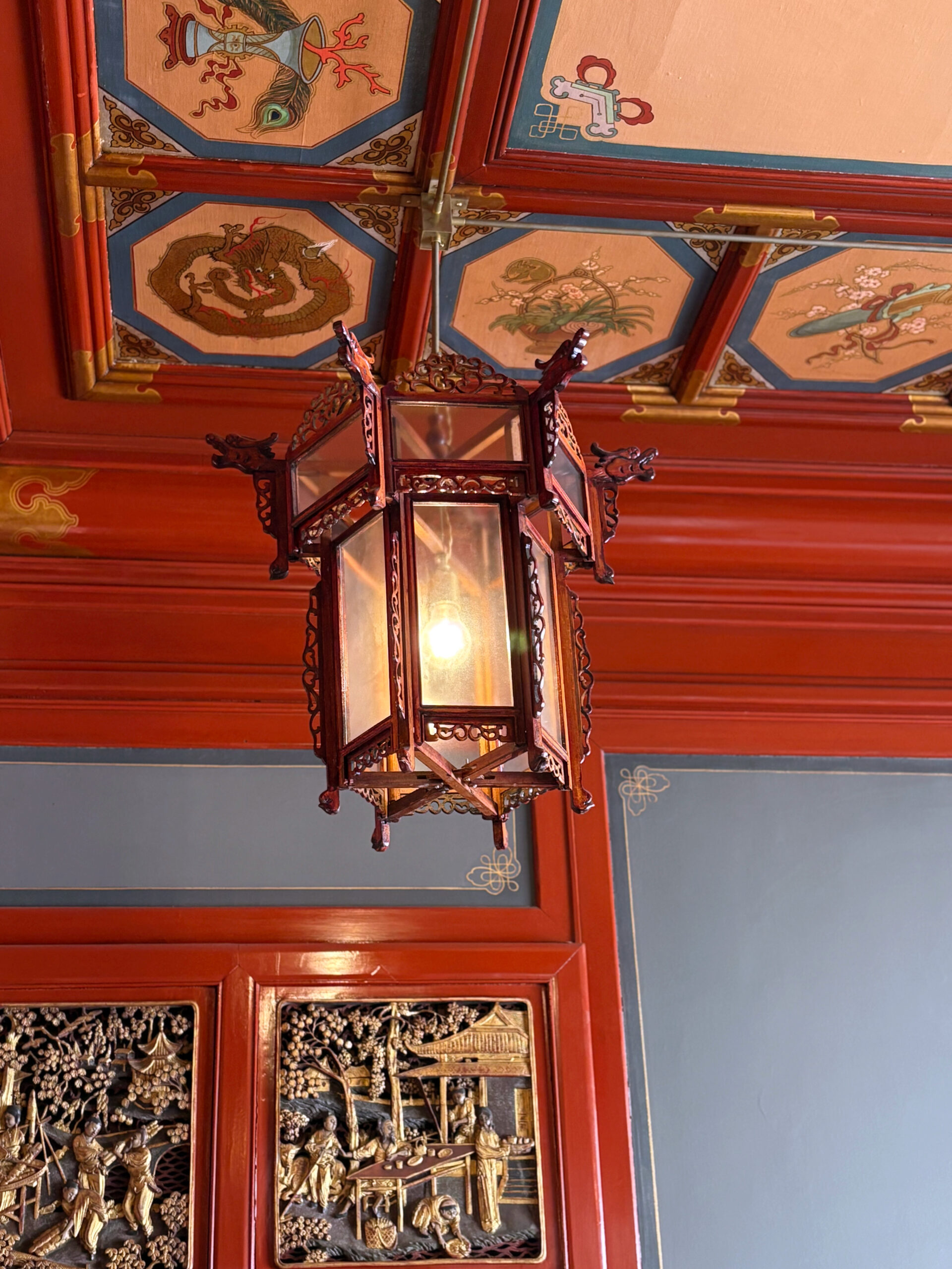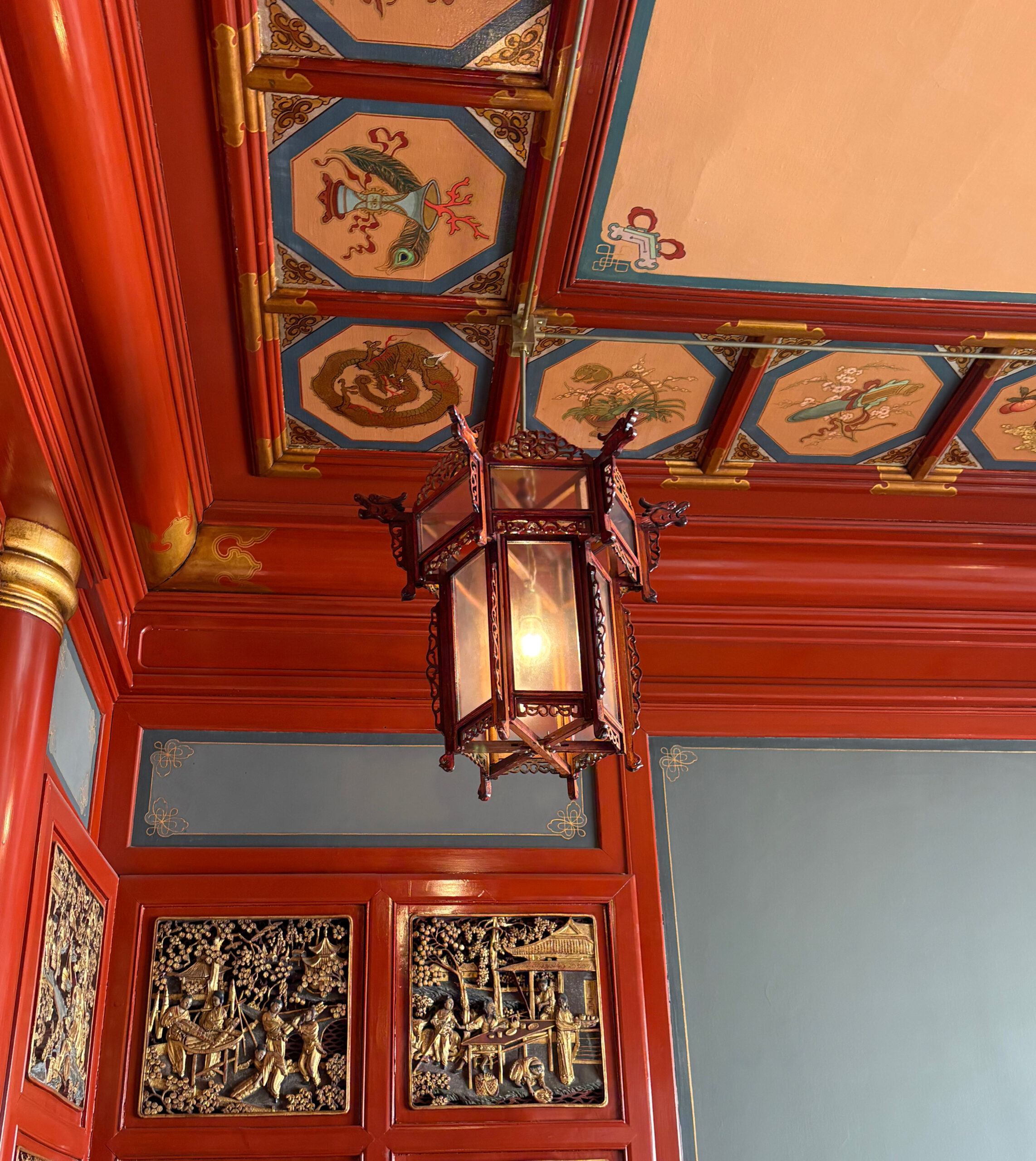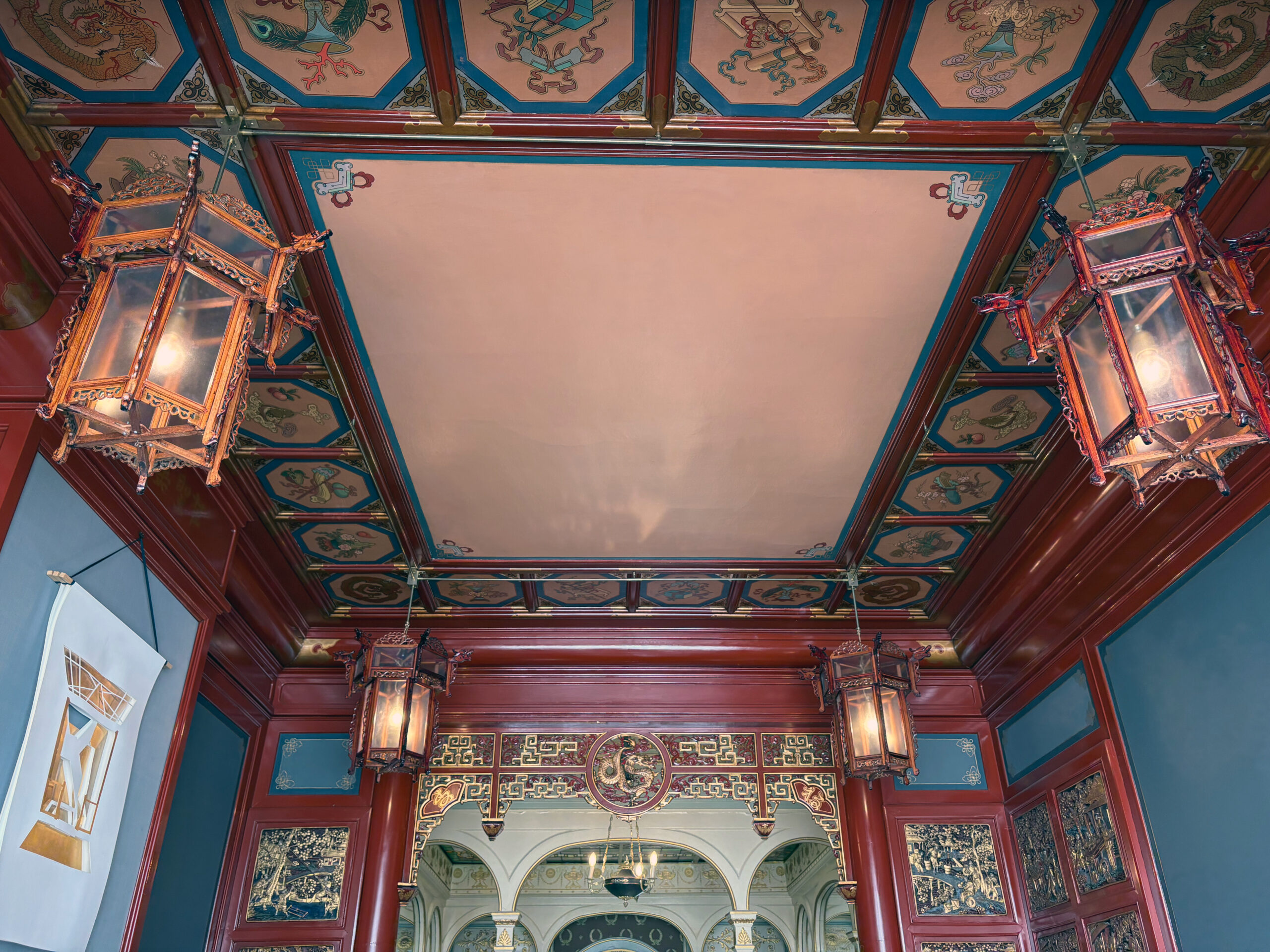 • Restauration de quatre lanternes chinoises, accompagnées de fixations sur mesure harmonieusement intégrées au plafond peint.