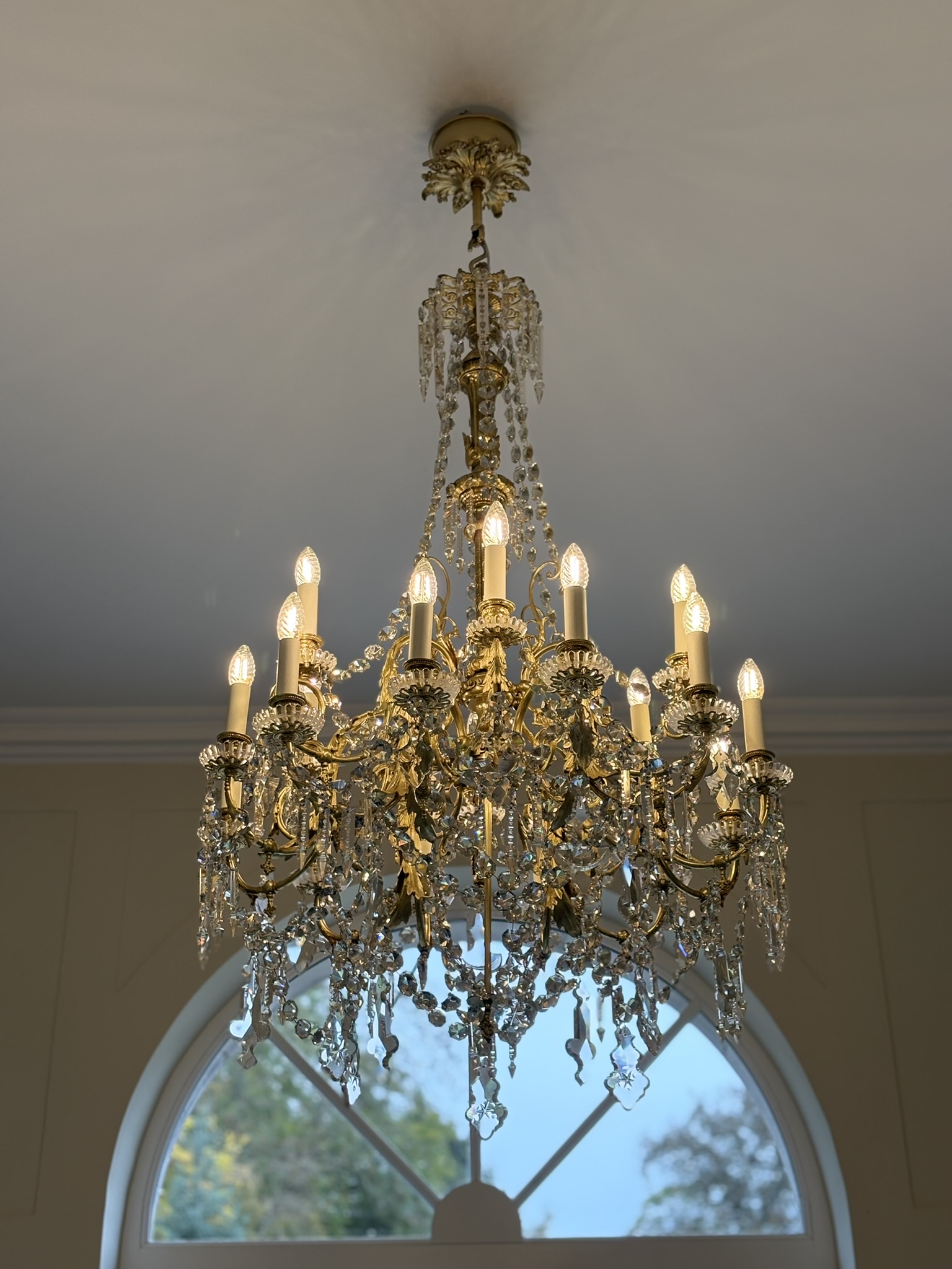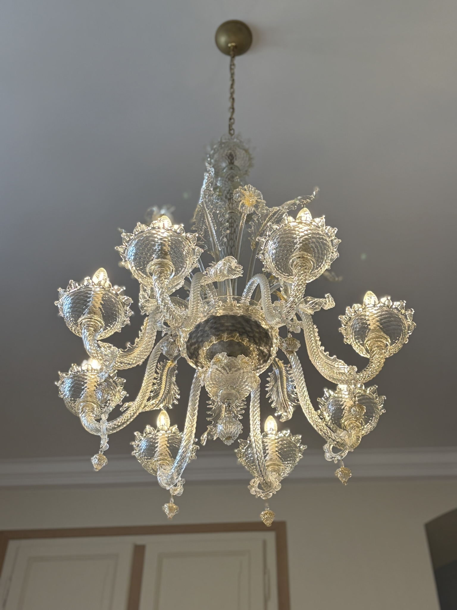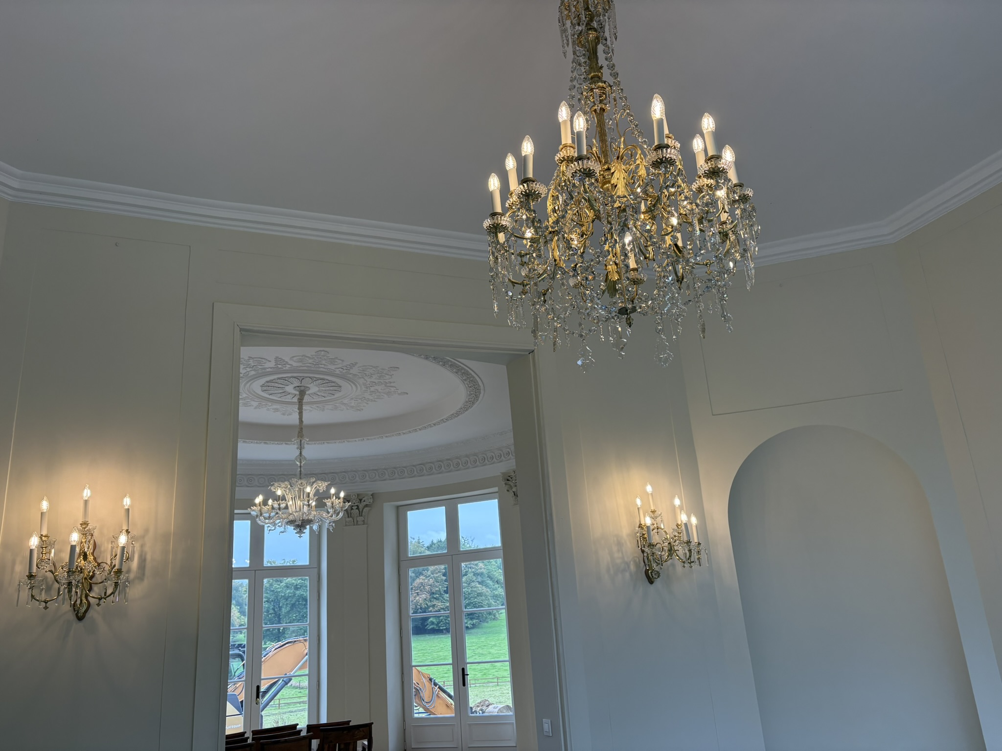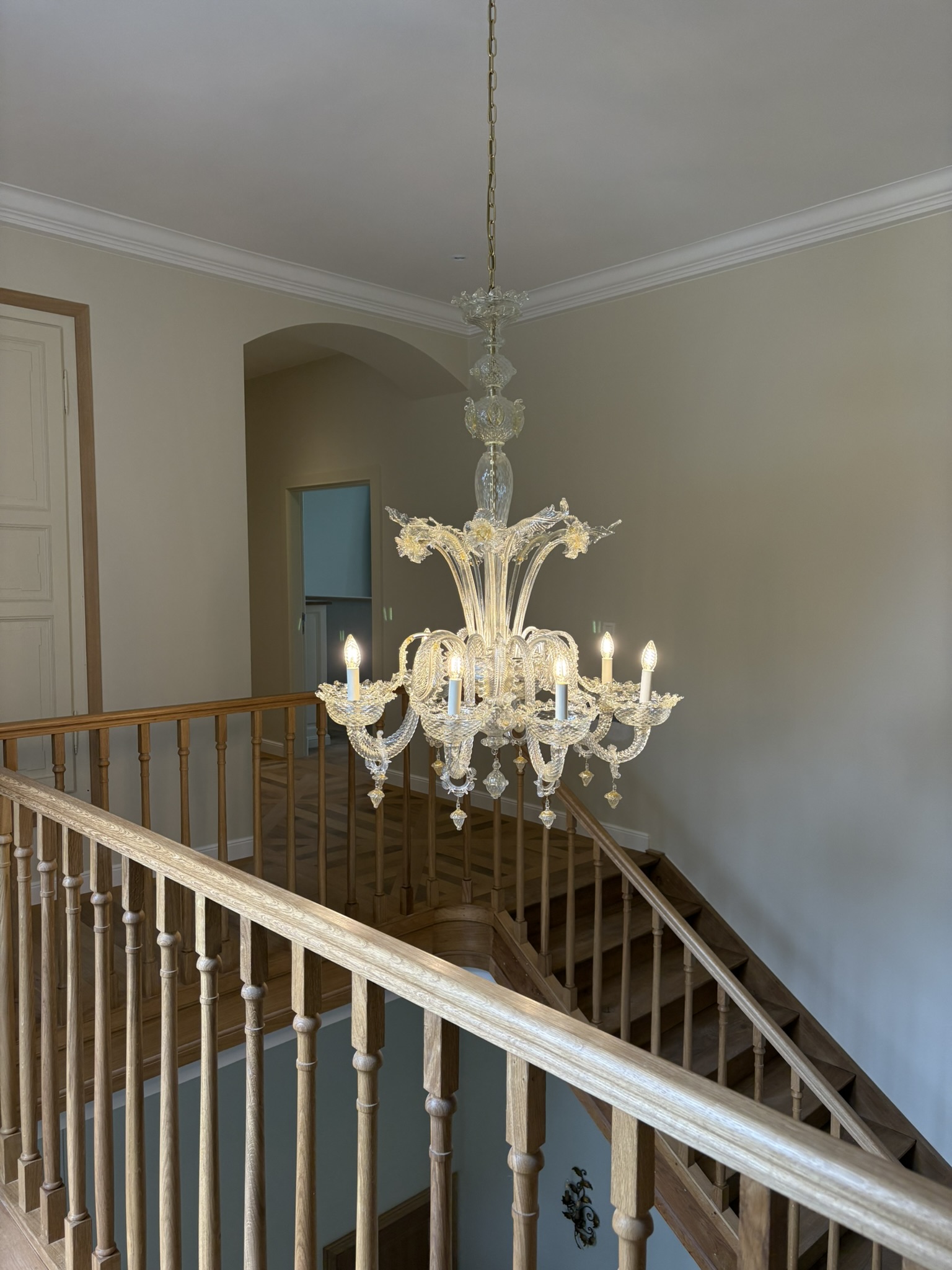 Au château de Buresse, nous avons restauré plusieurs pièces d’éclairage d’exception. Deux lustres Murano, l’un transparent et l’autre doré, ont été minutieusement restaurés afin de retrouver leur éclat d’origine. Nous avons également redonné vie à un ancien lustre à gaz, témoin du patrimoine historique du château. Pour parfaire l’harmonie de l’ensemble, nous avons recherché et restauré deux appliques qui s’accordent parfaitement avec le lustre à gaz, recréant ainsi une cohérence esthétique et historique au sein des lieux.