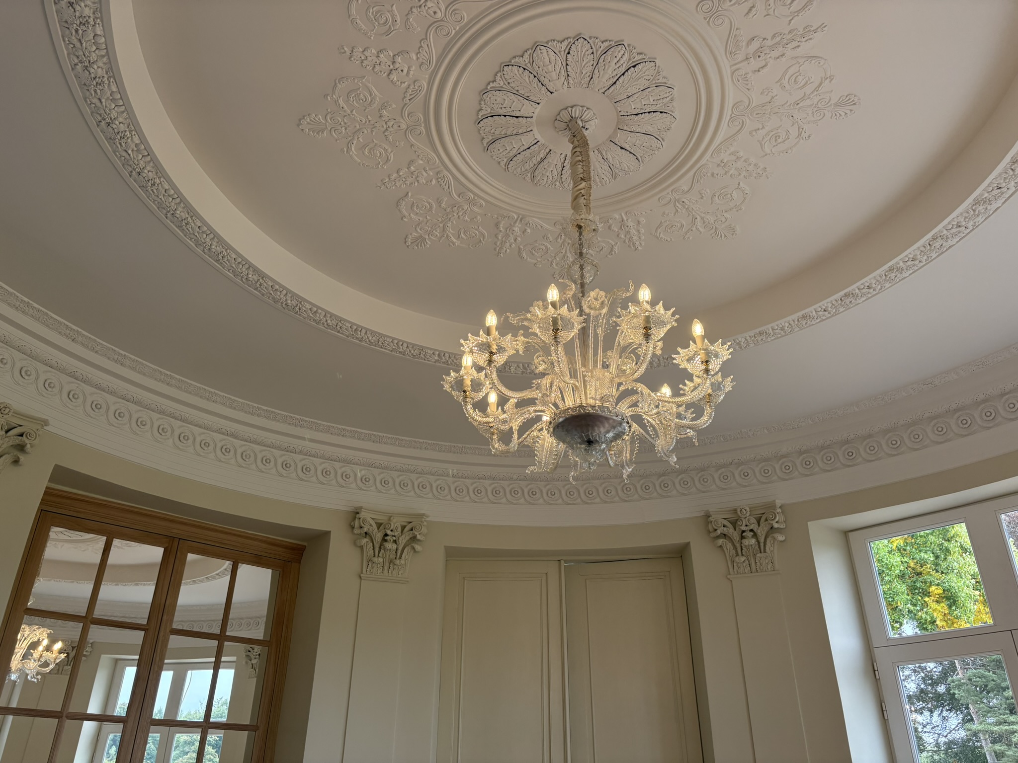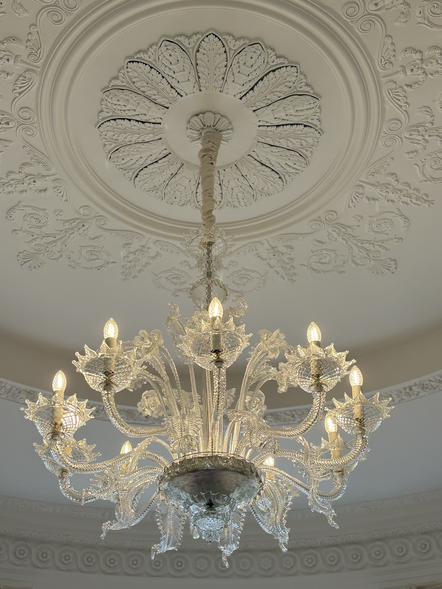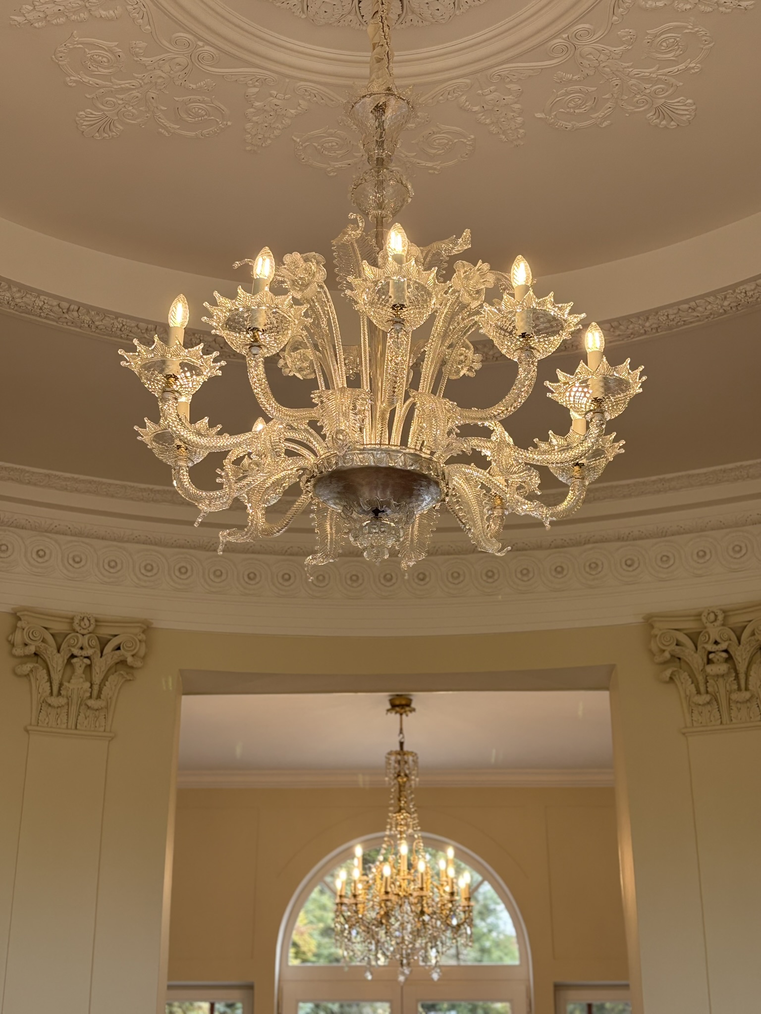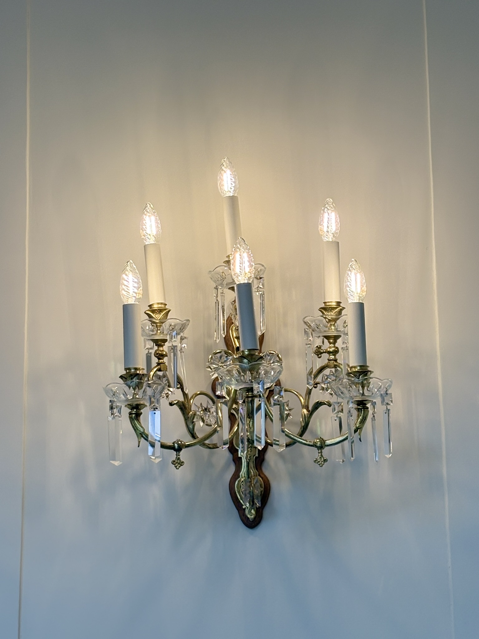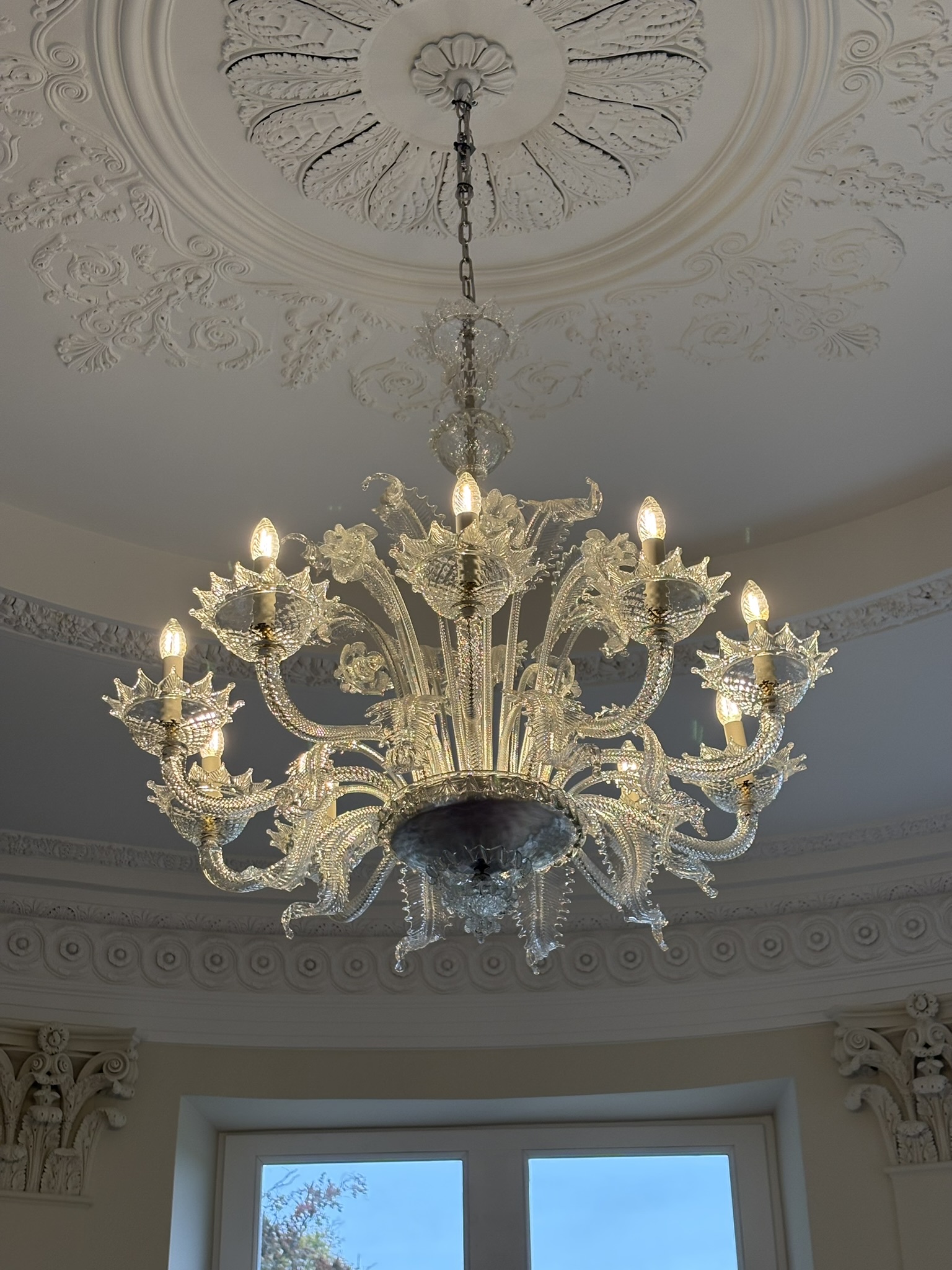 Au château de Buresse, nous avons restauré plusieurs pièces d’éclairage d’exception. Deux lustres Murano, l’un transparent et l’autre doré, ont été minutieusement restaurés afin de retrouver leur éclat d’origine. Nous avons également redonné vie à un ancien lustre à gaz, témoin du patrimoine historique du château. Pour parfaire l’harmonie de l’ensemble, nous avons recherché et restauré deux appliques qui s’accordent parfaitement avec le lustre à gaz, recréant ainsi une cohérence esthétique et historique au sein des lieux.
