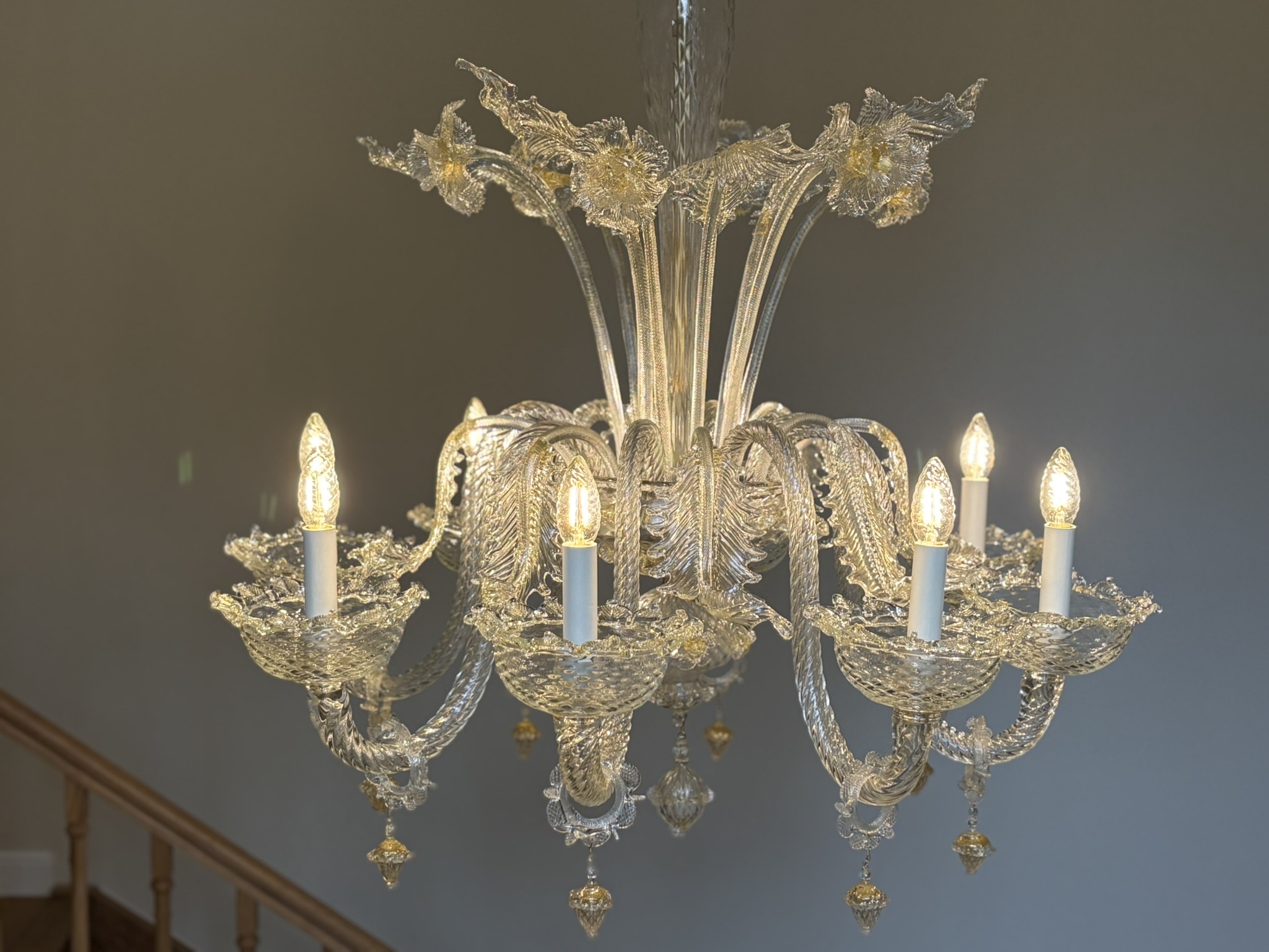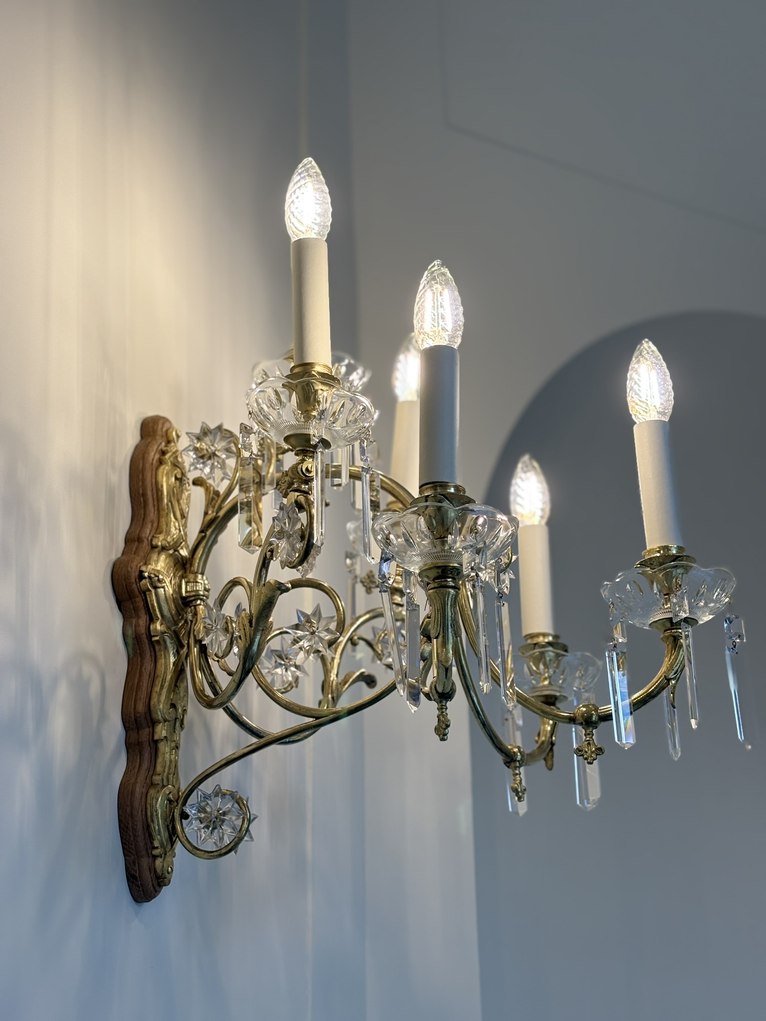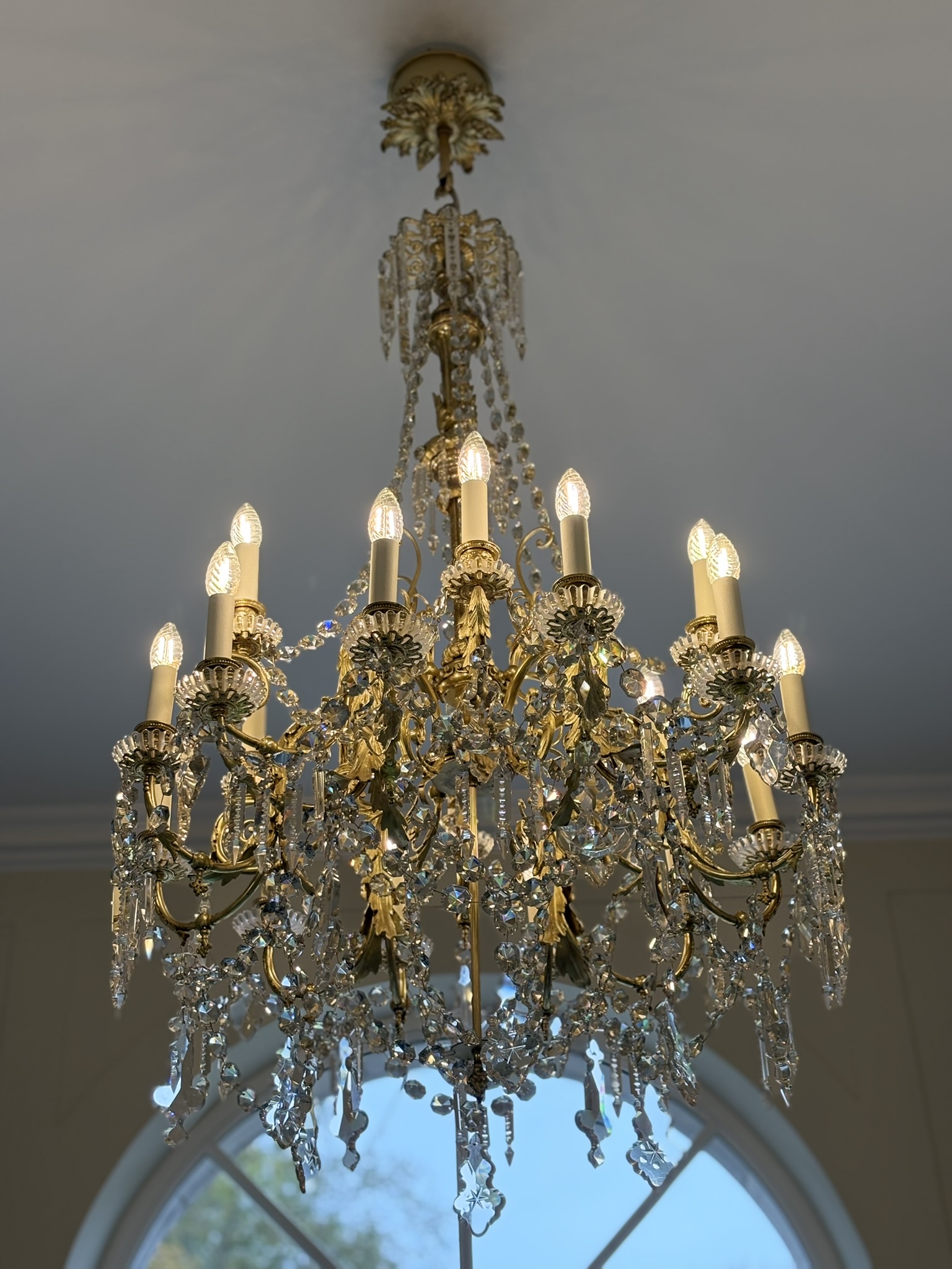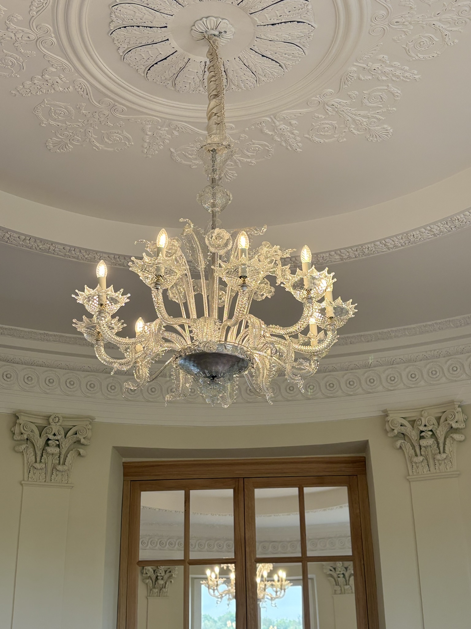 Au château de Buresse, nous avons restauré plusieurs pièces d’éclairage d’exception. Deux lustres Murano, l’un transparent et l’autre doré, ont été minutieusement restaurés afin de retrouver leur éclat d’origine. Nous avons également redonné vie à un ancien lustre à gaz, témoin du patrimoine historique du château. Pour parfaire l’harmonie de l’ensemble, nous avons recherché et restauré deux appliques qui s’accordent parfaitement avec le lustre à gaz, recréant ainsi une cohérence esthétique et historique au sein des lieux.